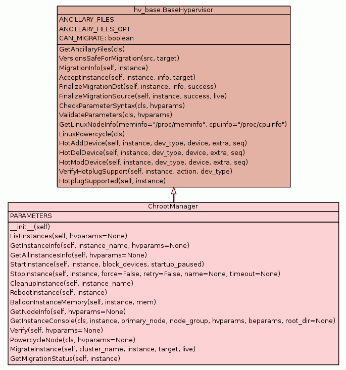 This not-really hypervisor allows ganeti to manage chroots. It has special behaviour and requirements on the OS definition and the node environemnt: